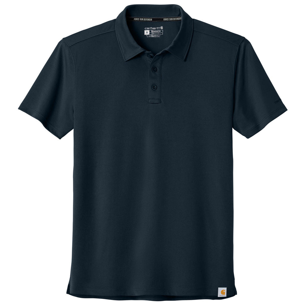 Carhartt Men's Navy Force Sun Defender Polo with a corporate logo combines rugged durability with sun protection technology. Crafted from lightweight, moisture-wicking fabric, it keeps you cool and comfortable during long hours outdoors. This polo is ideal for workers in the field or anyone needing reliable UV protection without sacrificing style and mobility.