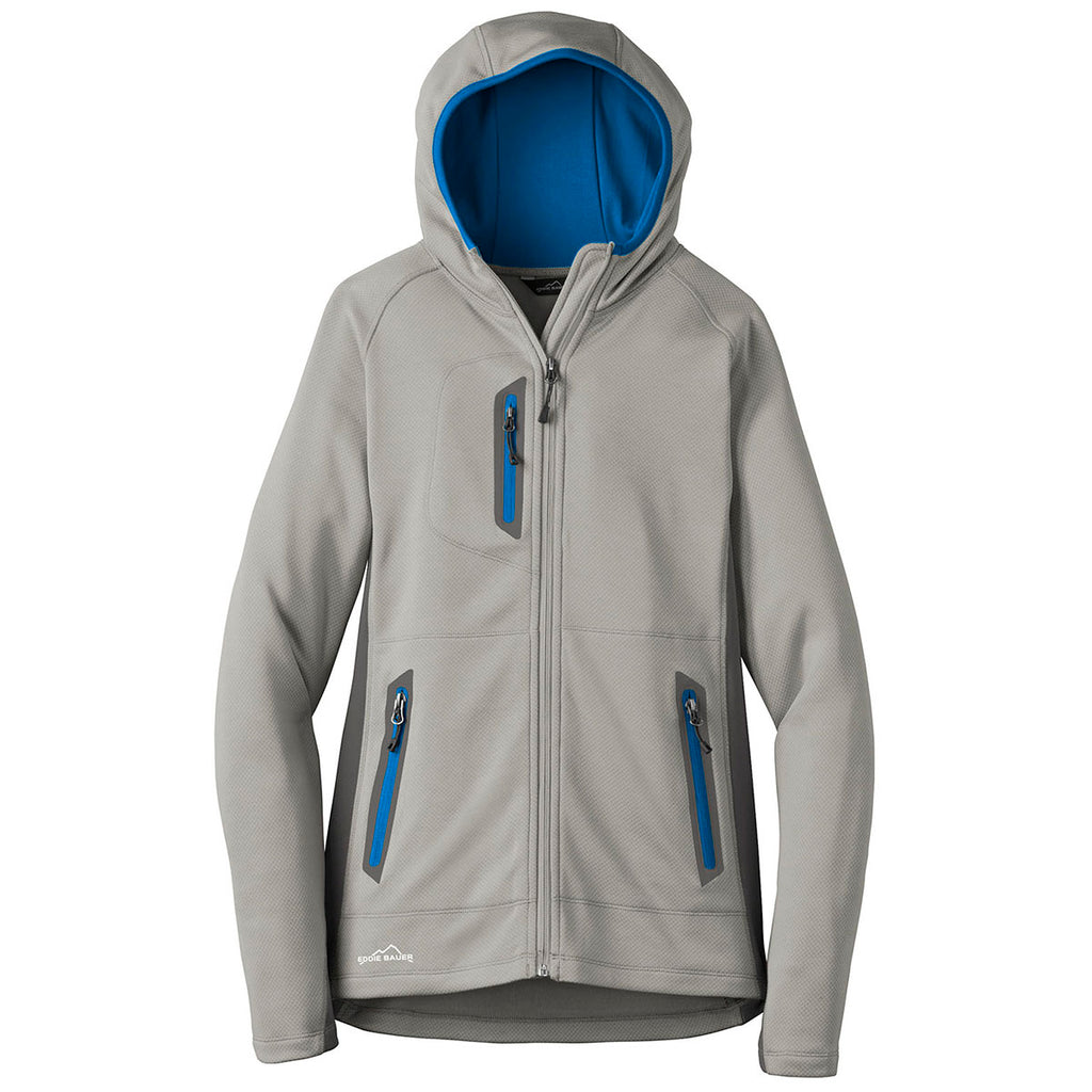 With a logo, you transform the Eddie Bauer Women's Grey Cloud/Grey Steel/Expedition Blue Sport Hooded Full-Zip Fleece Jacket into the leader among corporate issued jackets. Your company logo gets the word out about your brand at industry sales conferences. The medium weight jacket contains smooth faced fleece to deliver optimal comfort for every outdoor adventure. Rugged polyester resists the types of rips and tears caused by continued use. The welded zippered chest pocket gives you quick access to camping accessories and electronic devices. Give the thermal jacket to the members of your corporate team as a way of saying thank you for their hard work.