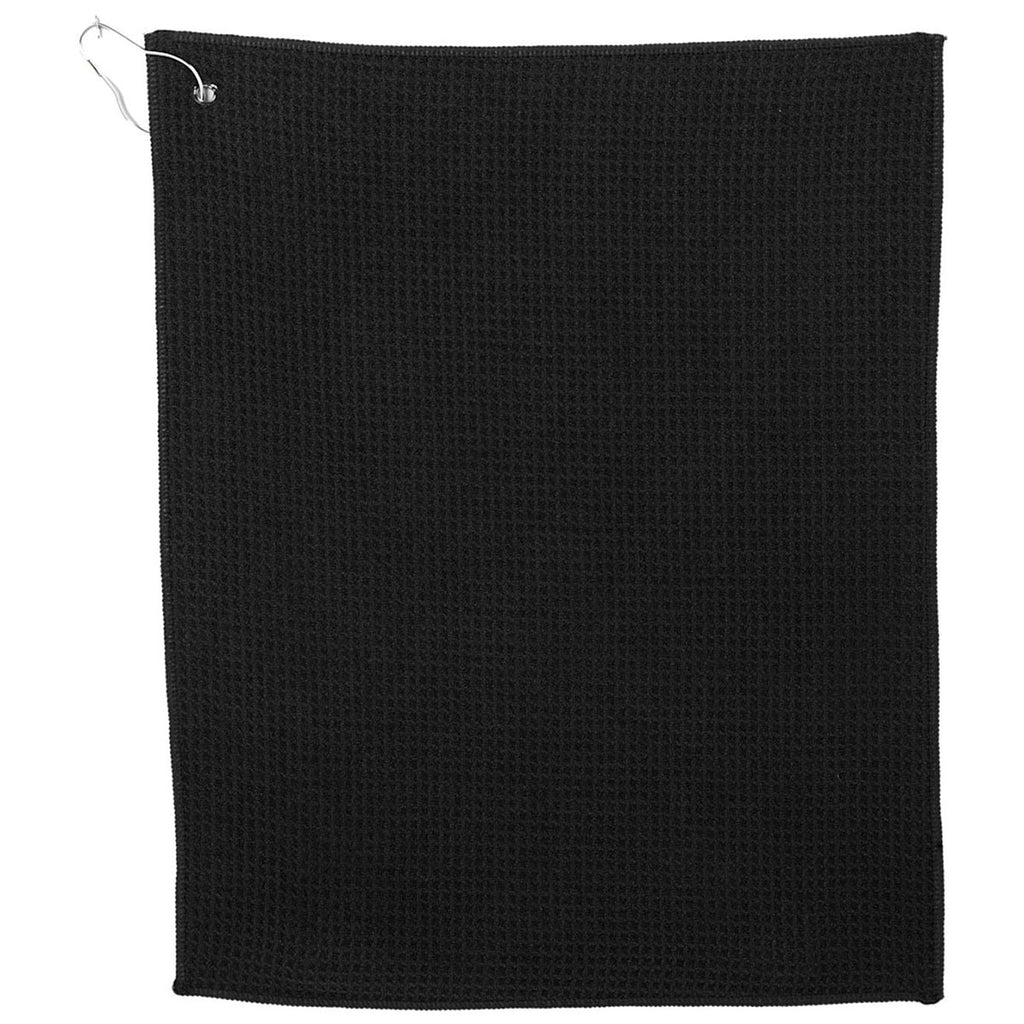 Add your corporate design to the Leed's Black 15" x 18" RPET 200g Microfiber Waffle Towel to sell at your pro shop or gift to the golfers in your life. The convenient waffle towel is sized for on-course cleaning and drying, while the metal grommet and hook can easily be attached to your golf bag for fast access.The minimum order for this product is 100 pieces.