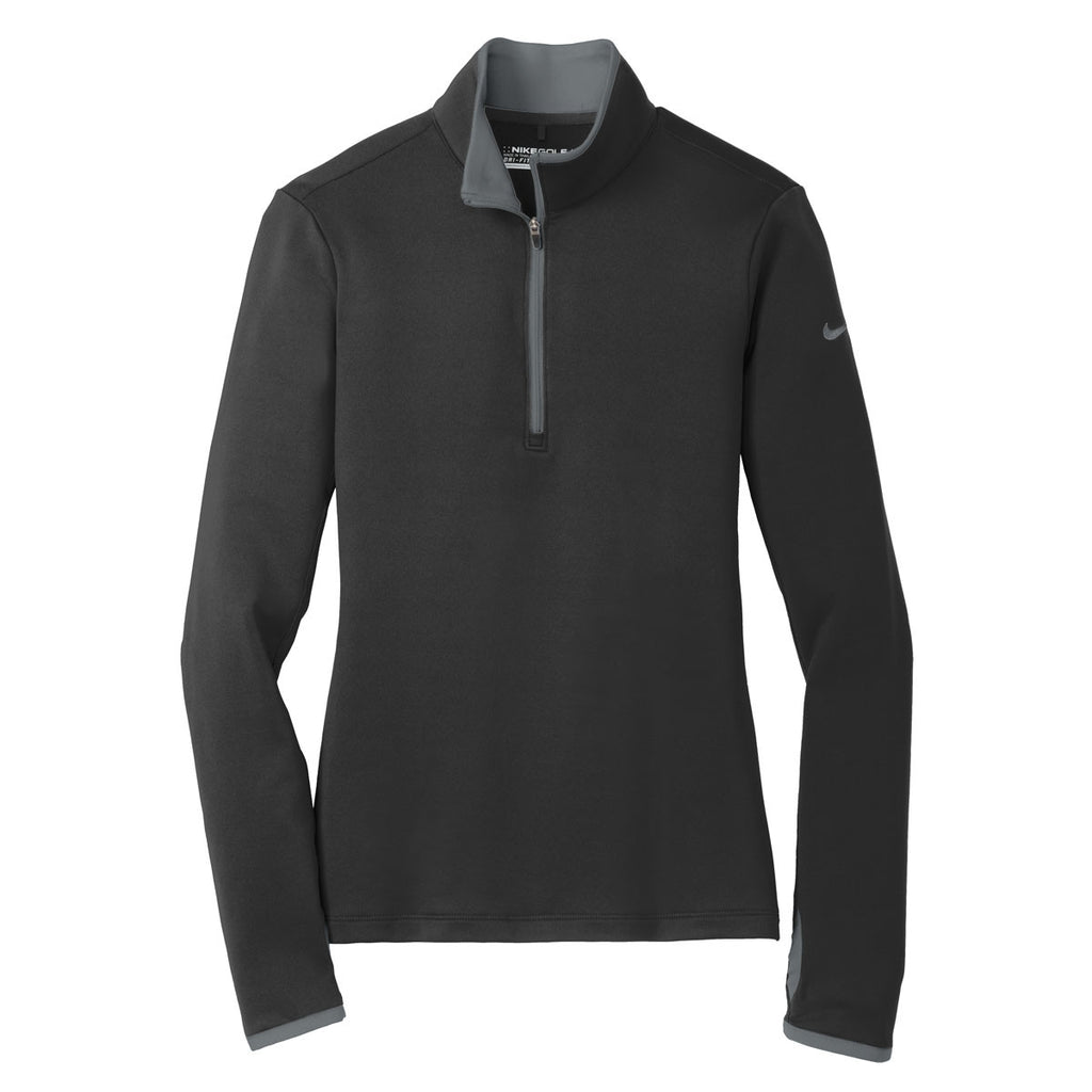 There's a reason why Nike is the most popular sportswear brand in the world: items like the custom logo Nike Women's Black/Grey Dri-FIT Stretch 1/2-Zip. Comfortable, fashion-forward, and tailor-made for your company logo, this is one heck of a branded quarter zip. With a tailored, feminine fit, and stretch built into the fabric, this is a zip-up that not only feels great, but looks great, too. It is made of a 93/7 polyester/spandex Dri-FIT fabric, with Dri-FIT moisture-wicking technology that will keep you cool and dry, and a contrast collar, open cuffs, and an open hem will keep you looking great. The trademark Swoosh is located on the sleeve, so that means you've got an open left chest for your embroidered corporate logo.