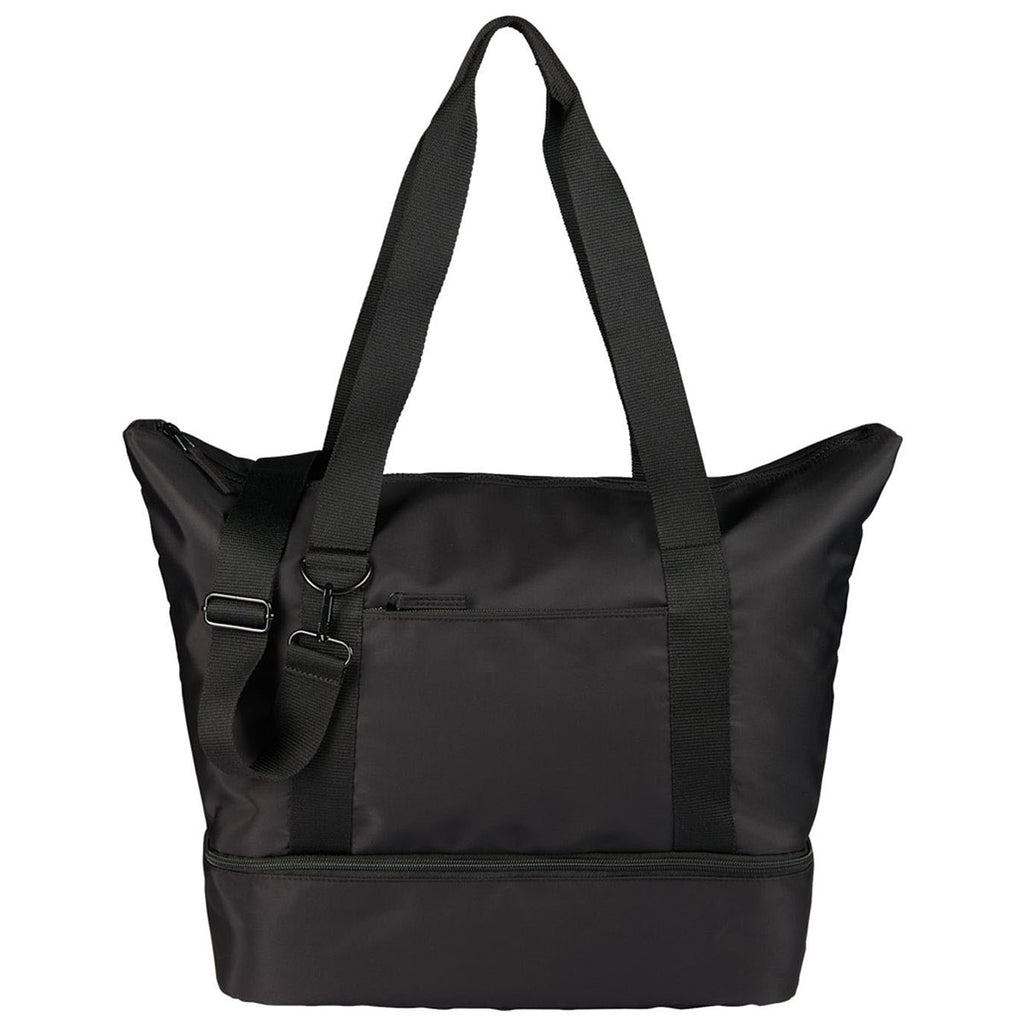 Choose a custom design for the Leed's Black Daybreak Recycled Travel Tote to enjoy an easy-to-carry bag for outdoor adventures. This spacious tote is ideal for snacks on long car rides or toys while visiting the beach. A zippered bottom compartment easily holds shoes or bulky items, and an inside laptop pocket means you can work from anywhere.The minimum order for this product is 24 pieces.