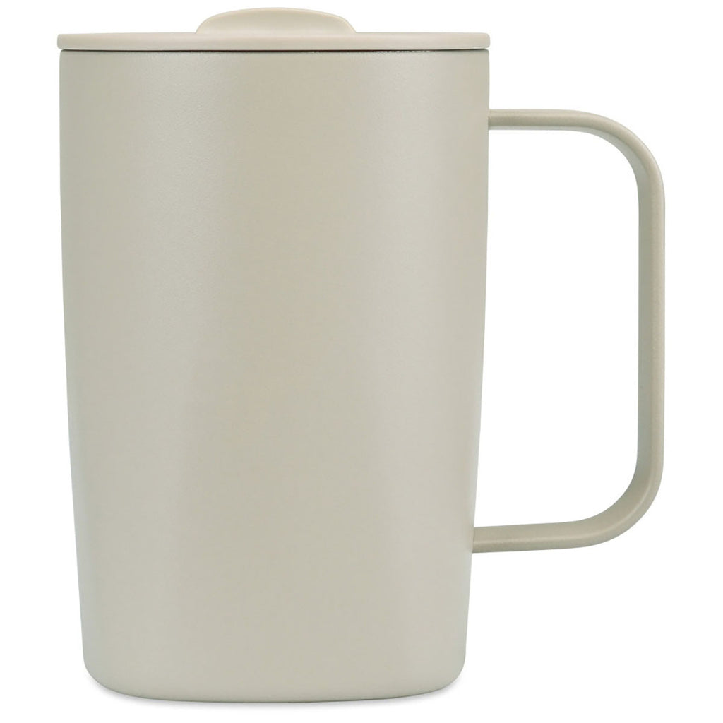 Aviana Taupe Rowan Recycled Mug - 15 Oz. with a corporate logo is a fun and eco-friendly way to offer guests coffee mugs that can be used as gifts. The stainless steel mug is sweatproof with a leak-resistant lid, making it great for coffee or tea on the go, on your morning commute, or as you lounge at home.