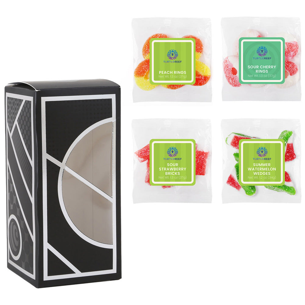SugarSpot Black Fruit Cocktail Sweetie Box with a custom logo will make your dessert table colorful and flavorful. The sweet assortment is reminiscent of fresh fruit salad in a sleek box. Consider these for quinceaneras, parties, or corporate events as a gift or addition to the menu. Place an order right away before these sell out.