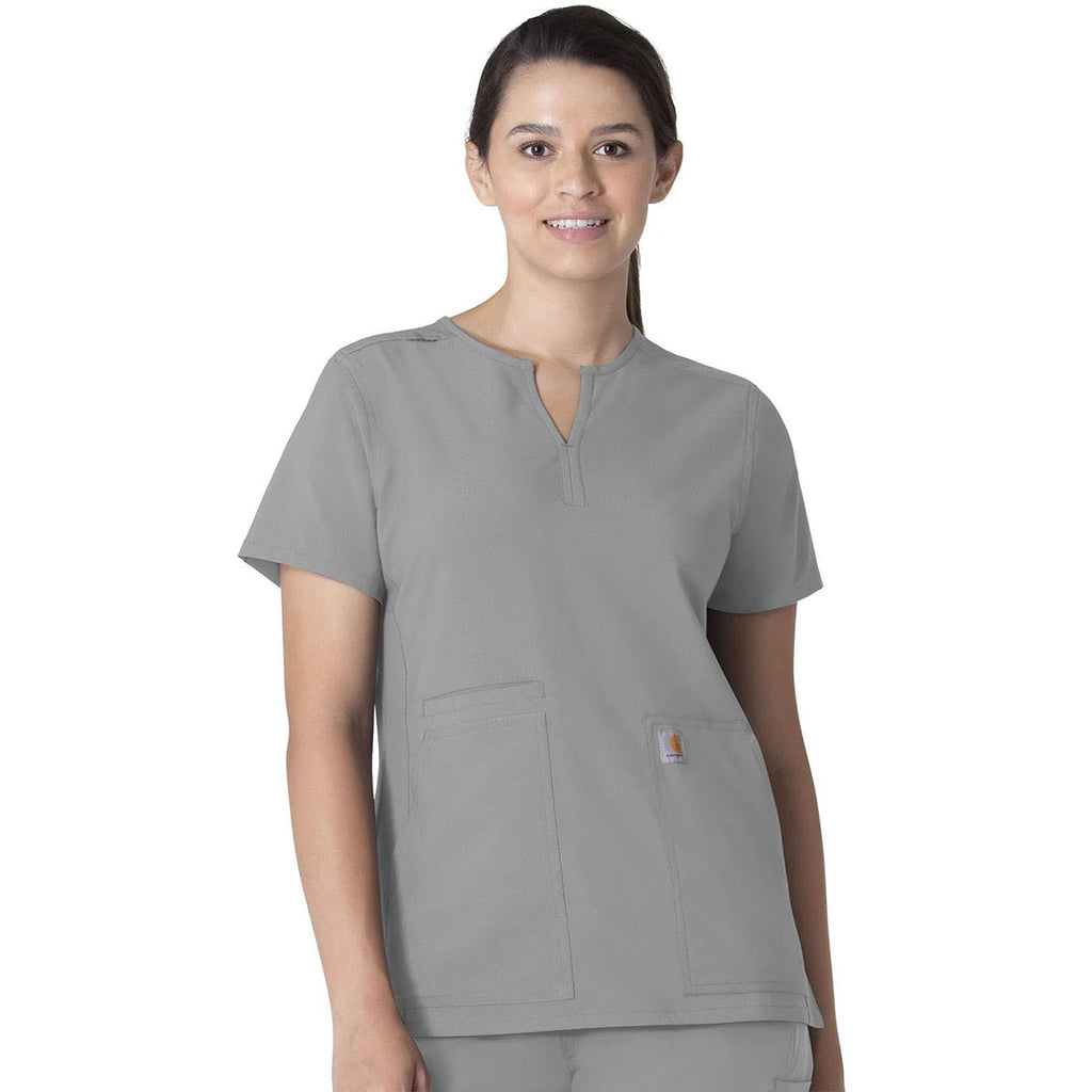 Carhartt Women's Grey Three-Pocket Modern Fit Notch Neck Top with a corporate logo creates a sleek, branded look for staff, employees, or even clients. Built to last, this top has technology to keep you cool, dry, and odor-free throughout the day. The unique neckline adds flair, while multiple pockets keep you organized with supplies at hand.Highlights