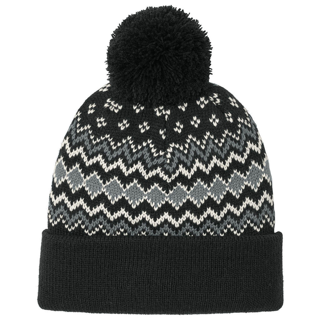 Port Authority Deep Black/Gusty Grey/Marshmallow Alpine Pom Beanie