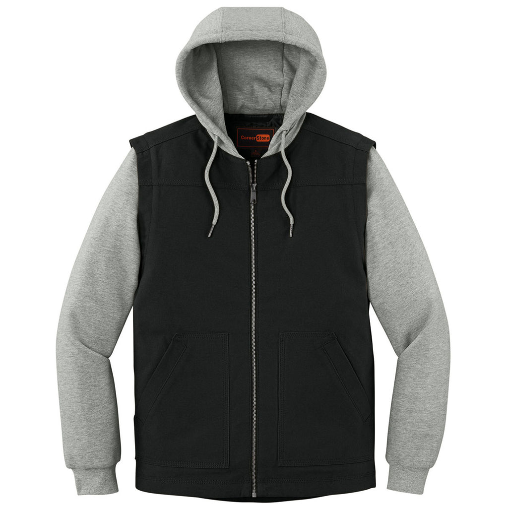 Corporate workwear is elevated with the CornerStone Men's Black/Heather Grey Duck Fleece Full-Zip Hooded Jacket. Built tough with a rugged exterior and warm fleece lining, it's designed for job sites and outdoor wear. Add your custom logo to make it a dependable piece of branded apparel that keeps your team protected while representing your company.