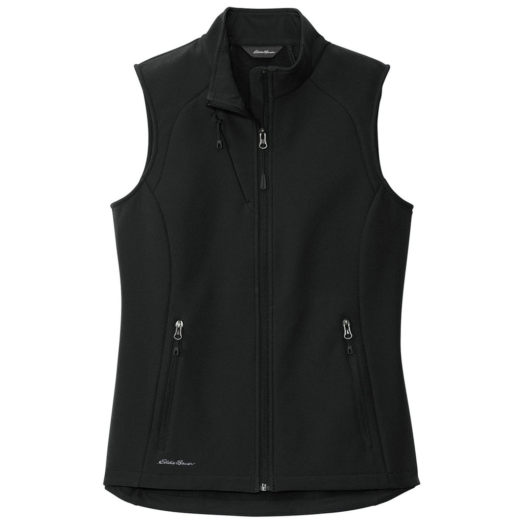 Order the Eddie Bauer Women's River Deep Black Stretch Soft Shell Vest for extra warmth on a chilly night. Easily layer with any dress shirt for a professional corporate look. Fleece lining for a soft and comfortable fall day. Add a custom logo and broadly display your company's brand.